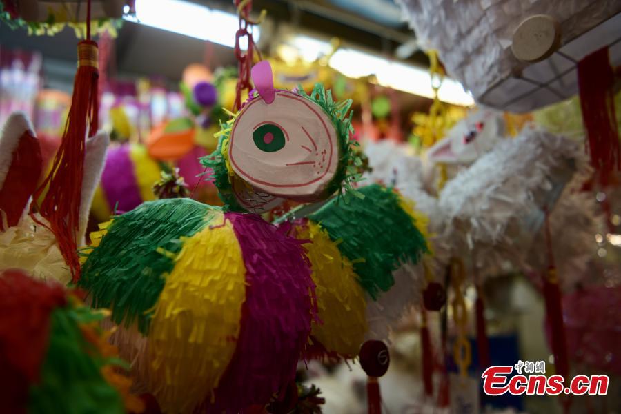 Photo shows a bunny-shaped handmade lantern at Tai Kiu Market in Yuen Long, Hong Kong Special Administrative Region. (Photo: China News Service/Li Zhihua)