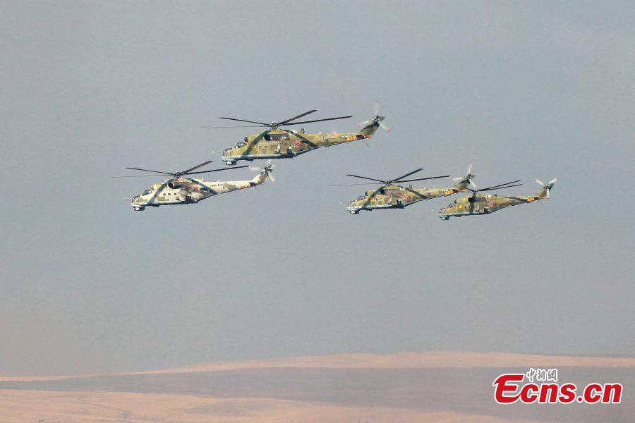 Helicopters fly in formation during the live-fire coordinated training session of the "Peace Mission 2021" in Orenburg, Russia, Sept. 15, 2021. (Photo: China News Service/Li Chun)