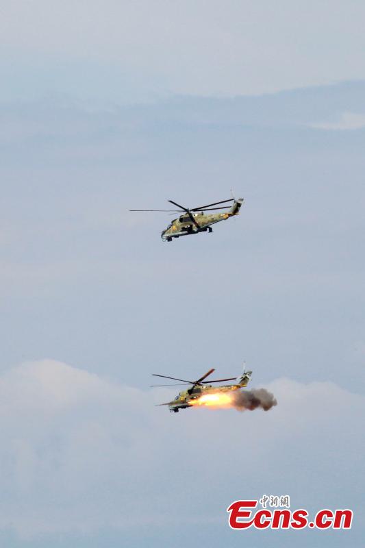 A helicopter fires during the live-fire coordinated training session of the "Peace Mission 2021" in Orenburg, Russia, Sept. 15, 2021. (Photo: China News Service/Li Chun)