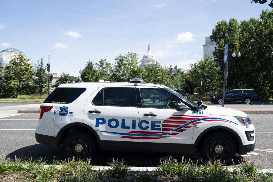 A police vehicle is seen near the Capitol building in Washington, D.C., the United States, on Aug. 19, 2021. (Xinhua/Liu Jie)