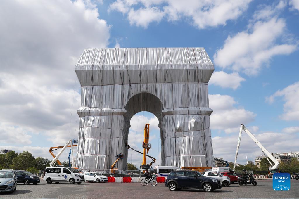 Photo taken on Sept. 16, 2021 shows the wrapped Arc de Triomphe in Paris, France. The entire Arc de Triomphe at the top of the Champs-Elysees in Paris is to stay wrapped in fabric for two weeks, an art installation conceived by the late artist Christo and inaugurated on Thursday by French President Emmanuel Macron. The 50-meter high, 45-meter long and 22-meter wide monument built by Napoleon, is now wrapped head to toe in 25,000 square metres of recyclable silvery-blue fabric and 3,000 meters of red rope. (Xinhua/Gao Jing)