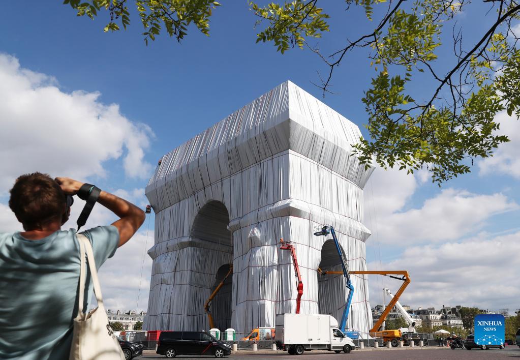 A man takes photos of the wrapped Arc de Triomphe before an inauguration in Paris, France, on Sept. 16, 2021. The entire Arc de Triomphe at the top of the Champs-Elysees in Paris is to stay wrapped in fabric for two weeks, an art installation conceived by the late artist Christo and inaugurated on Thursday by French President Emmanuel Macron. The 50-meter high, 45-meter long and 22-meter wide monument built by Napoleon, is now wrapped head to toe in 25,000 square metres of recyclable silvery-blue fabric and 3,000 meters of red rope. (Xinhua/Gao Jing)