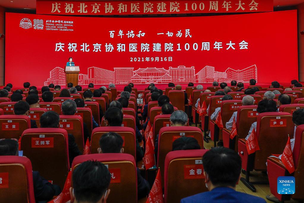 A celebration marking the 100th anniversary of the founding of Peking Union Medical College Hospital (PUMCH) is held in Beijing, capital of China, Sept. 16, 2021. (Xinhua/Zhang Yuwei)