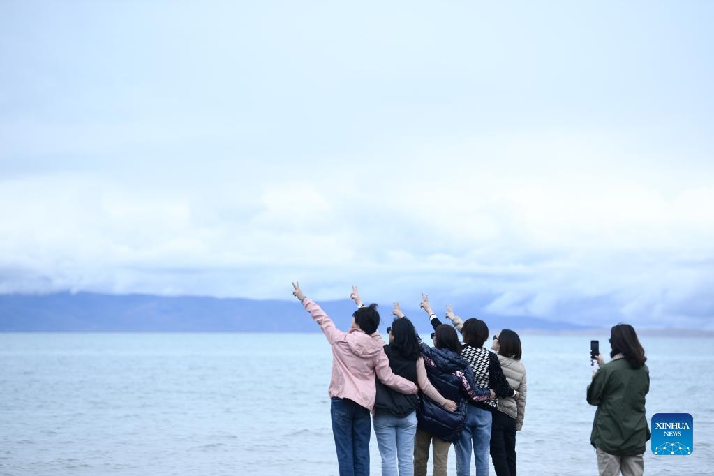 Tourists pose for photos in Qinghai Lake scenic area in northwest China's Qinghai Province, Sept. 15, 2021. Located in the northeastern part of the Qinghai-Tibet Plateau, the Qinghai Lake is key to maintaining the ecological balance in western China. It is also a natural barrier for controlling the eastward spread of desertification and ensuring the safety of agricultural areas in eastern China. In recent years, the Chinese government has implemented various ecological projects in the Qinghai Lake Basin, and achieved remarkable results in restoring the environment. (Xinhua/Zhang Long)