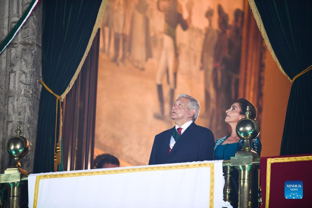 Mexican President Andres Manuel Lopez Obrador (L) and his wife attend the Independence Day celebrations in Mexico City, capital of Mexico, Sept. 15, 2021. (Xinhua/Xin Yuewei)