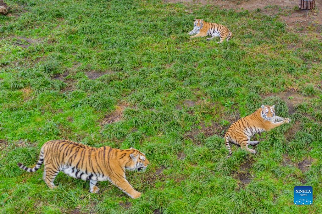 Aerial photo taken on Sept. 15, 2021 shows Siberian tigers idling on the lawn at a forest park under the China Hengdaohezi Feline Breeding Center in northeast China's Heilongjiang Province, . (Xinhua/Xie Jianfei)
