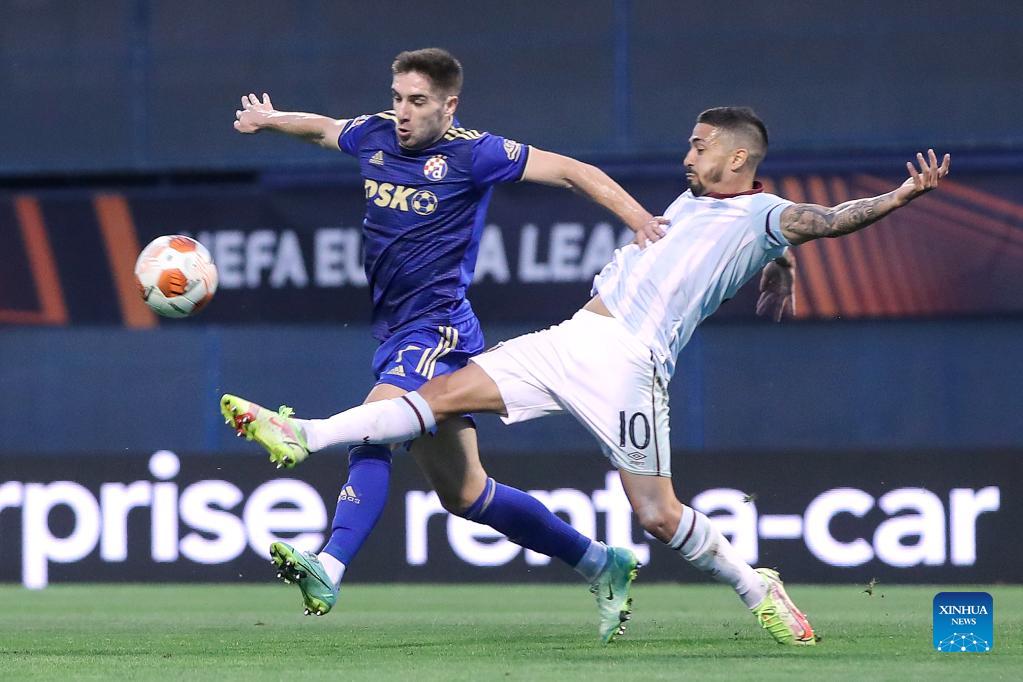 Luka Ivanusec (L) of Dinamo Zagreb vies with Manuel Lanzini of West Ham United during the UEFA Europa League group H match between Dinamo Zagreb and West Ham United at Maksimir Stadium in Zagreb, Croatia, on Sept. 16, 2021. (Goran Stanzl/Pixsell via Xinhua)