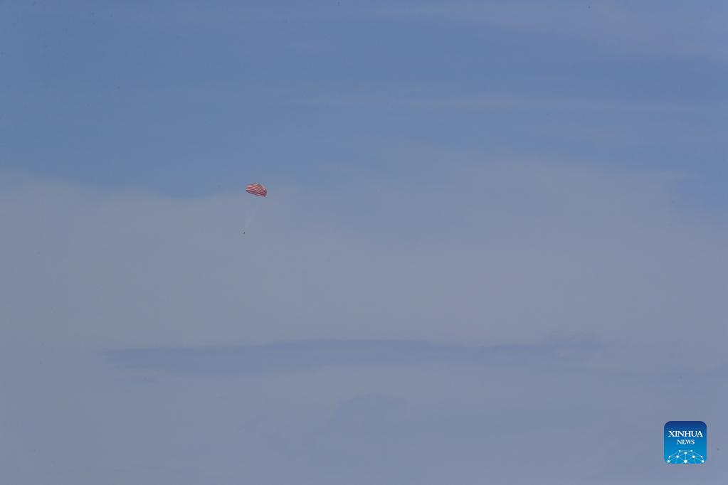 The return capsule of the Shenzhou-12 manned spaceship is about to land at the Dongfeng landing site in north China's Inner Mongolia Autonomous Region on Sept. 17, 2021. (Xinhua/Ju Zhenhua)