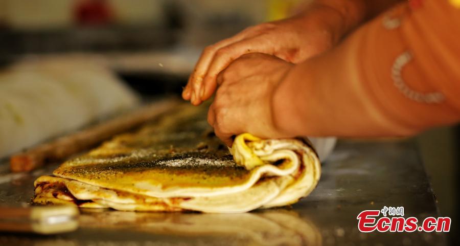 A person roll up layers of flattened dough coated with seasonings in Yuzhong County, northwest China's Gansu Province. (Photo: China News Service/Zhang Wen)
