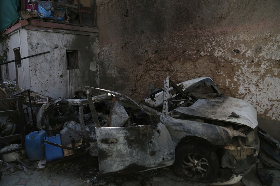 Photo taken on Sept. 2, 2021 shows a damaged vehicle at the site of the U.S. airstrike in Kabul, capital of Afghanistan. (Photo by Saifurahman Safi/Xinhua)