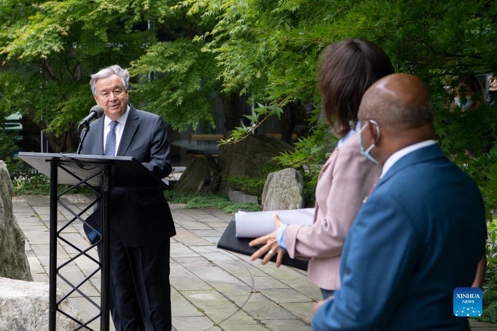 UN Secretary-General Antonio Guterres (L) makes a speech at a UN peace bell ceremony to mark the International Day of Peace at UN Headquarters in New York, on Sept. 17, 2021. Guterres on Friday called for solidarity and unity on the occasion of the International Day of Peace, which falls on Sept. 21. (Eskinder Debebes/UN Photo/Handout via Xinhua)