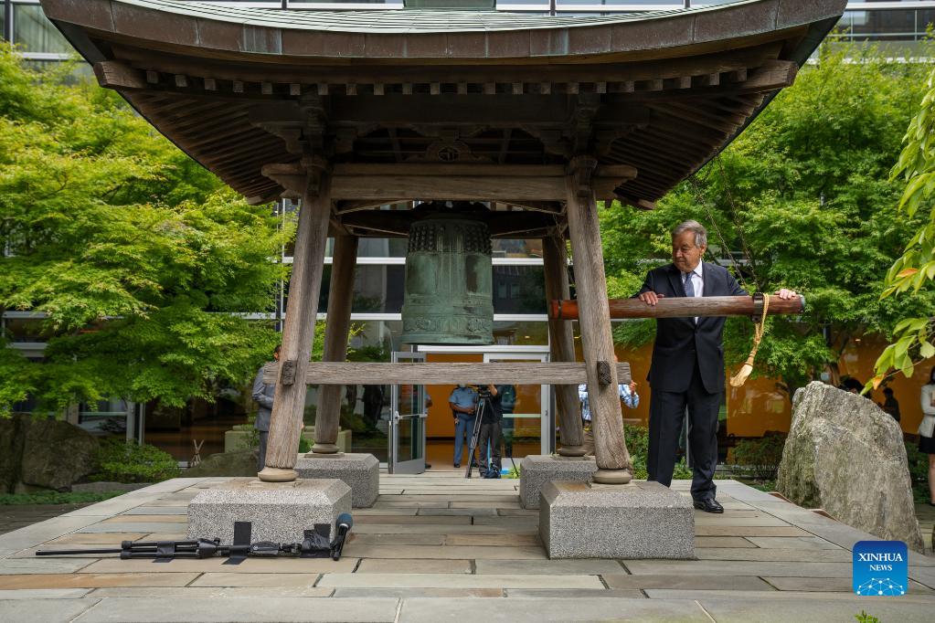UN Secretary-General Antonio Guterres strikes the peace bell at a ceremony to mark the International Day of Peace at UN Headquarters in New York, on Sept. 17, 2021. Guterres on Friday called for solidarity and unity on the occasion of the International Day of Peace, which falls on Sept. 21. (Cia Pak/UN Photo/Handout via Xinhua)