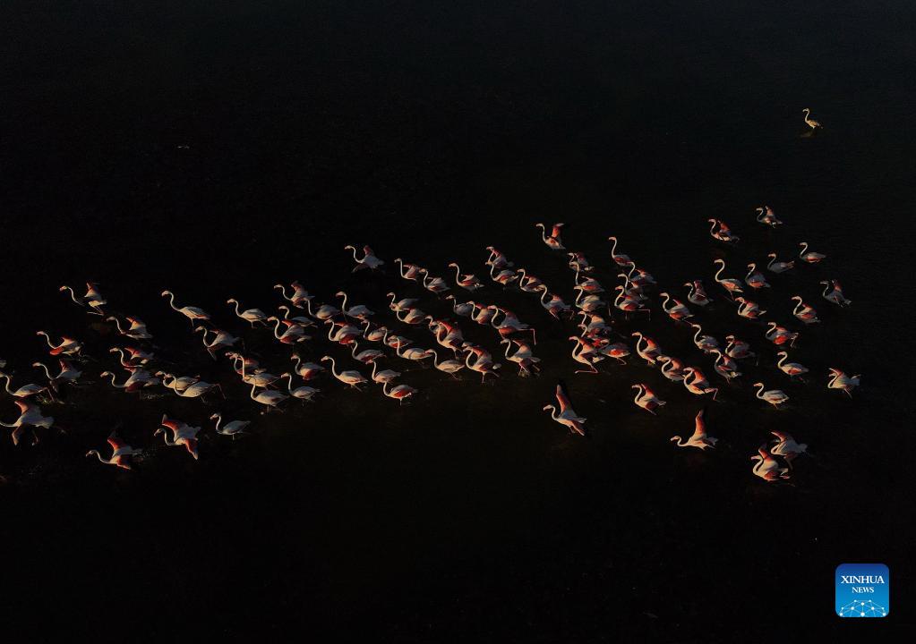 Aerial photo taken on Sept. 17, 2021 shows flamingos in Mogan Lake in Ankara, Turkey. (Photo by Mustafa Kaya/Xinhua)