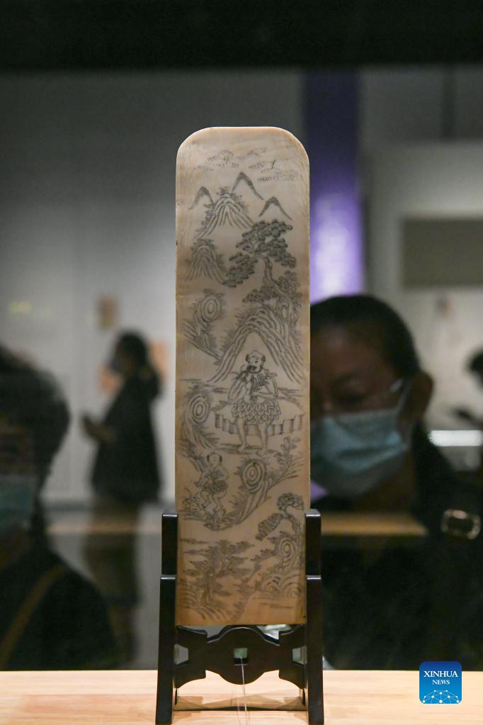 Photo taken on Sept. 17, 2021 shows an ivory plate depicting Shennong (Celestial Farmer) tasting medicinal herbs displayed during an exhibition featuring traditional Chinese medicine relics in Chengdu Museum in Chengdu, capital of southwest China's Sichuan Province. The exhibition, which kicked off here on Friday, showcases more than 300 traditional Chinese medicine-related relics. (Xinhua/Xu Bingjie)