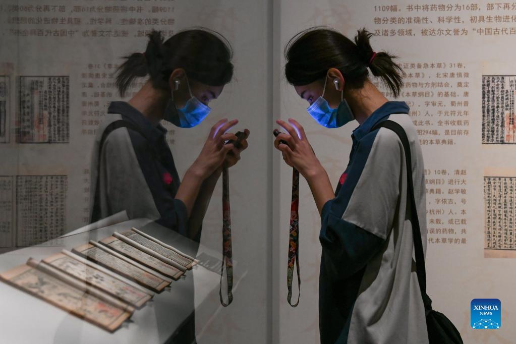A woman visits an exhibition featuring traditional Chinese medicine relics in Chengdu Museum in Chengdu, capital of southwest China's Sichuan Province, Sept. 17, 2021. The exhibition, which kicked off here on Friday, showcases more than 300 traditional Chinese medicine-related relics. (Xinhua/Xu Bingjie)