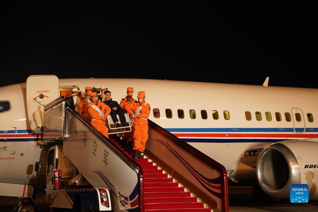 Astronaut Nie Haisheng waves to the crowd on his arrival in Beijing, capital of China, Sept. 17, 2021. Three Chinese astronauts, the first sent to orbit for space station construction, have completed their three-month mission and returned to Earth safely on Friday. They arrived in Beijing by plane Friday night. (Photo by Guo Zhongzheng/Xinhua)