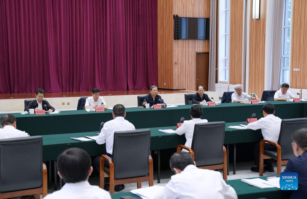 Zhao Leji, a member of the Standing Committee of the Political Bureau of the Communist Party of China (CPC) Central Committee and secretary of the CPC Central Commission for Discipline Inspection, presides over a seminar at the regional-level discipline inspection and supervision organs in north China's Inner Mongolia Autonomous Region, Sept. 15, 2021. Zhao made an inspection tour to Inner Mongolia Autonomous Region from Wednesday to Friday. (Xinhua/Zhang Ling)