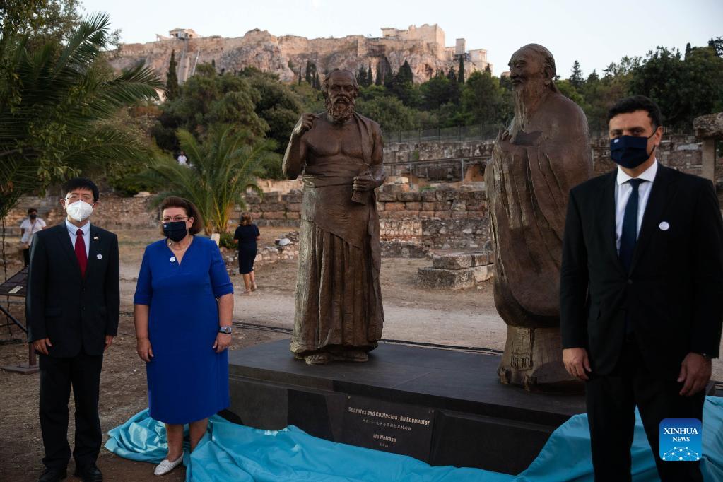 Wang Qiang, charge d'affaires minister-counselor of the Chinese Embassy in Greece, Greek Culture and Sports Minister Lina Mendoni and Greek Minister of Tourism Vassilis Kikilias (from L to R) pose for a photo during the unveiling ceremony of a sculpture featuring ancient Greek philosopher Socrates and Chinese philosopher Confucius, in Athens, Greece on Sept. 16, 2021. The China-Greece Year of Culture and Tourism opened on Thursday with a ceremony held at the foot of the Athens Acropolis, as officials of both sides expressed confidence in a stronger friendship and further cooperation between the two peoples. (Xinhua/Marios Lolos)