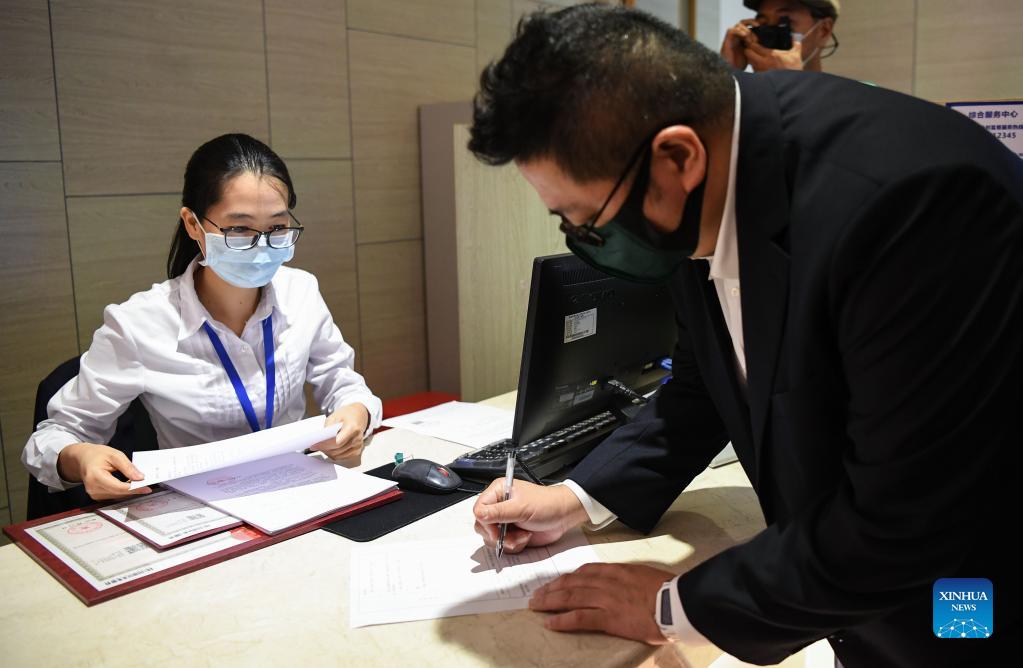 A company representative fills in a form at the integrated services center of Guangdong-Macao In-depth Cooperation Zone in Hengqin, in Zhuhai City, south China's Guangdong Province, Sept. 17, 2021. Administrative organizations of the Guangdong-Macao In-depth Cooperation Zone in Hengqin were inaugurated on Friday. On Sept. 5, China's central authorities issued a general plan for building a Guangdong-Macao in-depth cooperation zone in Hengqin, which is located in the southern part of Zhuhai City in Guangdong Province, just across the Macao Special Administrative Region. (Xinhua/Deng Hua)