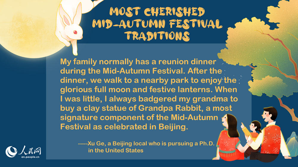 Every year, all members of Xu's family get together, sharing a reunion dinner. After dinner, they will walk to a nearby park to enjoy the glorious full moon and festive lanterns. In Xu's mind, the most significant component for the Mid-Autumn Festival in Beijing is not the moon cakes, but Tu'Er Ye or Grandpa Rabbit.