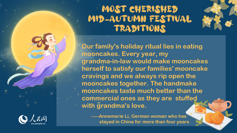 "Our family's holiday ritual lies in eating mooncakes," said Anne. Every year, Anne's grandma-in-law would make the food herself to satisfy their families' mooncake cravings and they always would rip open the mooncakes together. "The homemade mooncake tastes much better than the commercial one as they are stuffed with grandma's love," she said. Even Anne's parents are a big fan of her grandma-in-law's mooncakes, as she sometimes would bring the homemade mooncakes back to Germany. "Because of me, my parents are familiar with this traditional Chinese holiday and they love mooncakes."