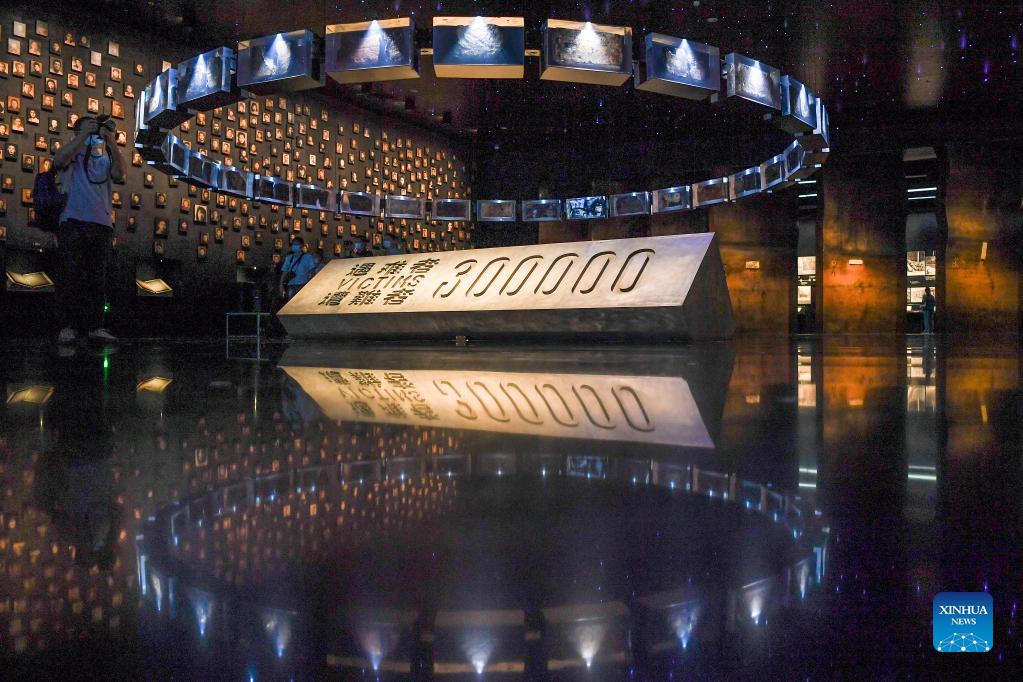 A reporter takes photos at the Memorial Hall of the Victims in Nanjing Massacre by Japanese Invaders in Nanjing, capital of east China's Jiangsu Province, Sept. 18, 2021. The memorial hall held a ceremony on Saturday to commemorate Nanjing Massacre survivors who have passed away this year. At present, the number of registered survivors of the massacre has decreased to 64. (Xinhua/Li Bo)