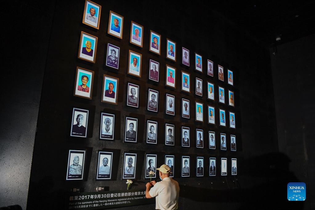 A relative of Nanjing Massacre survivor Cai Lihua presents a flower at the Memorial Hall of the Victims in Nanjing Massacre by Japanese Invaders in Nanjing, capital of east China's Jiangsu Province, Sept. 18, 2021. Cai Lihua passed away this year. The memorial hall held a ceremony on Saturday to commemorate Nanjing Massacre survivors who have passed away this year. At present, the number of registered survivors of the massacre has decreased to 64. (Xinhua/Li Bo)