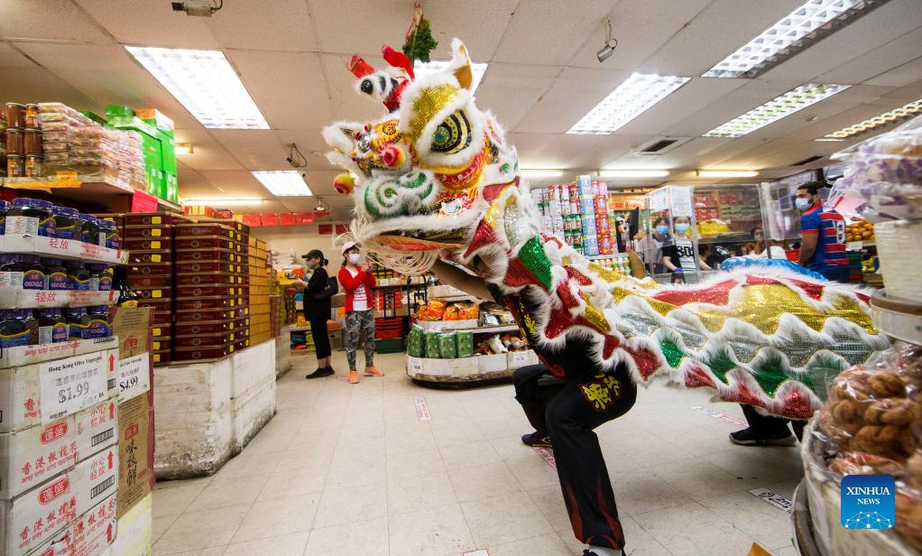 People perform a lion dance inside a grocery store at the Chinatown in Toronto, Canada, on Sept. 18, 2021. A traditional lion dance parade was held here on Saturday to celebrate the upcoming Mid-Autumn Festival. (Photo by Zou Zheng/Xinhua)