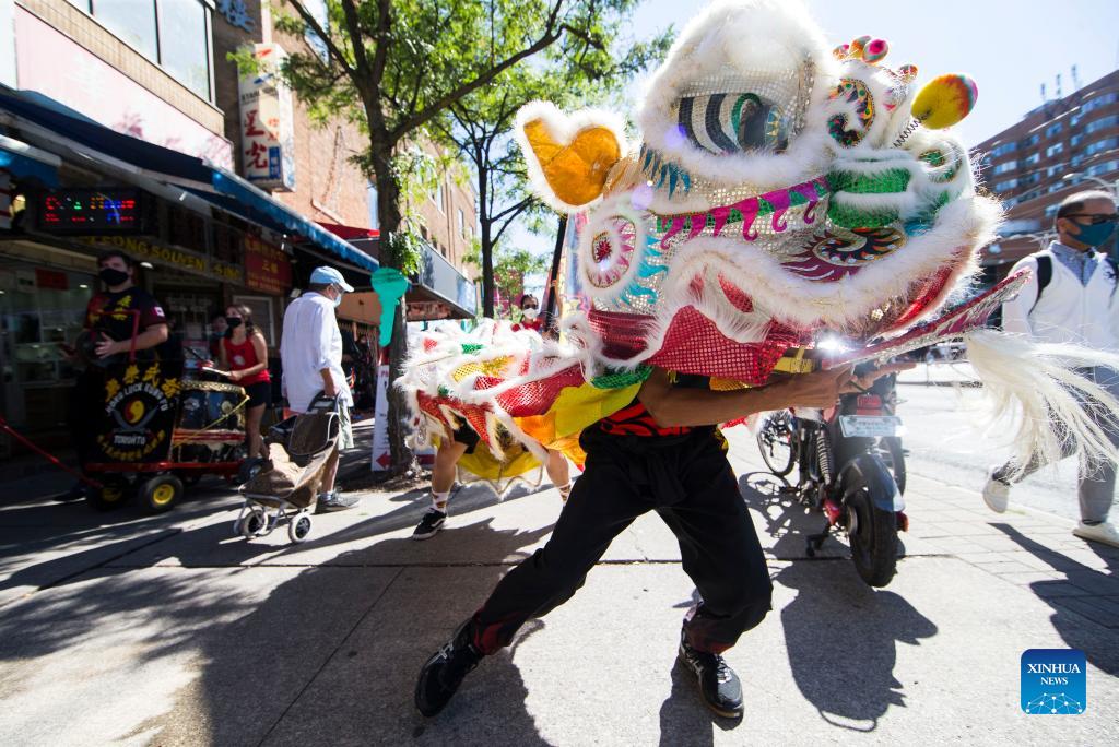People perform a lion dance at the Chinatown in Toronto, Canada, on Sept. 18, 2021. A traditional lion dance parade was held here on Saturday to celebrate the upcoming Mid-Autumn Festival. (Photo by Zou Zheng/Xinhua)