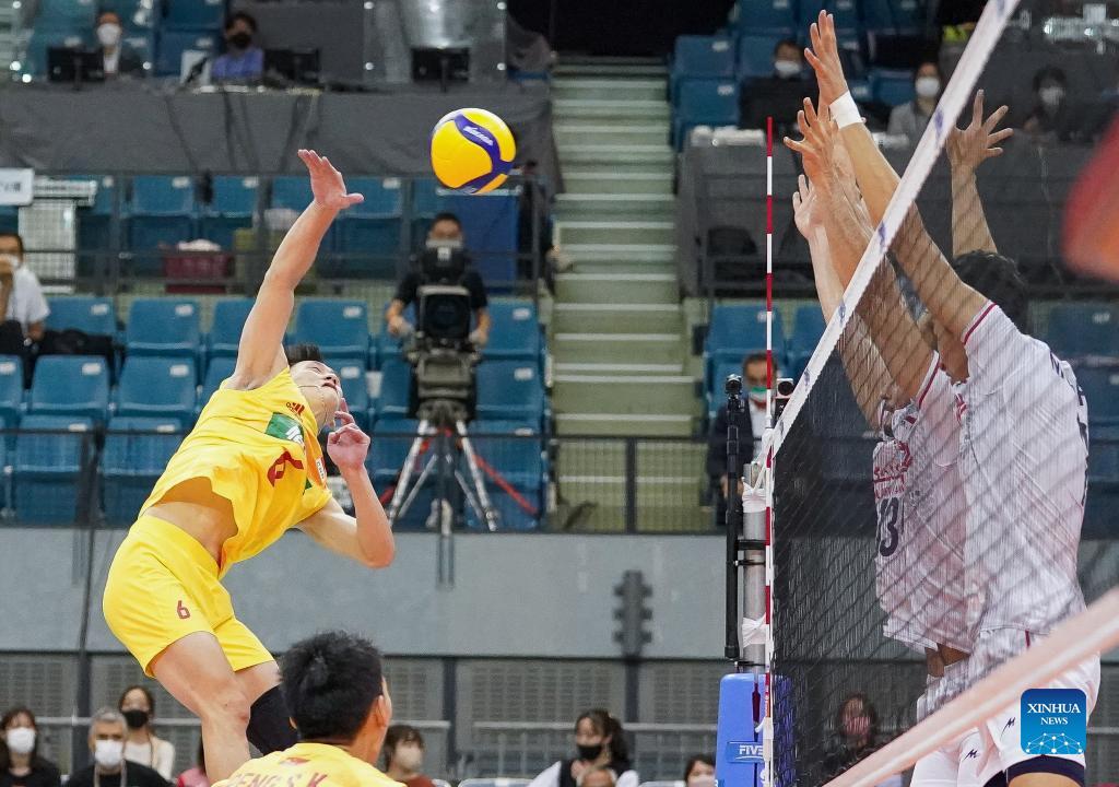 Yu Yuantai (L) of China spikes during the semi-final against Iran at the 21st Asian Senior Men's Volleyball Championship in Chiba, Japan on Sept. 18, 2021. (Photo by Christopher Jue/Xinhua)