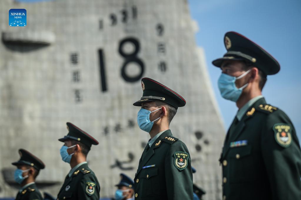 A bell-tolling ceremony marking the 90th anniversary of the "September 18 Incident" is held at the September 18 Incident History Museum in Shenyang, capital of northeast China's Liaoning Province, Sept. 18, 2021. Sirens sounded and a huge bell tolled in Shenyang on Saturday in commemoration of the September 18 Incident 90 years ago that marked the start of Japan's 14-year invasion of China. (Xinhua/Pan Yulong)