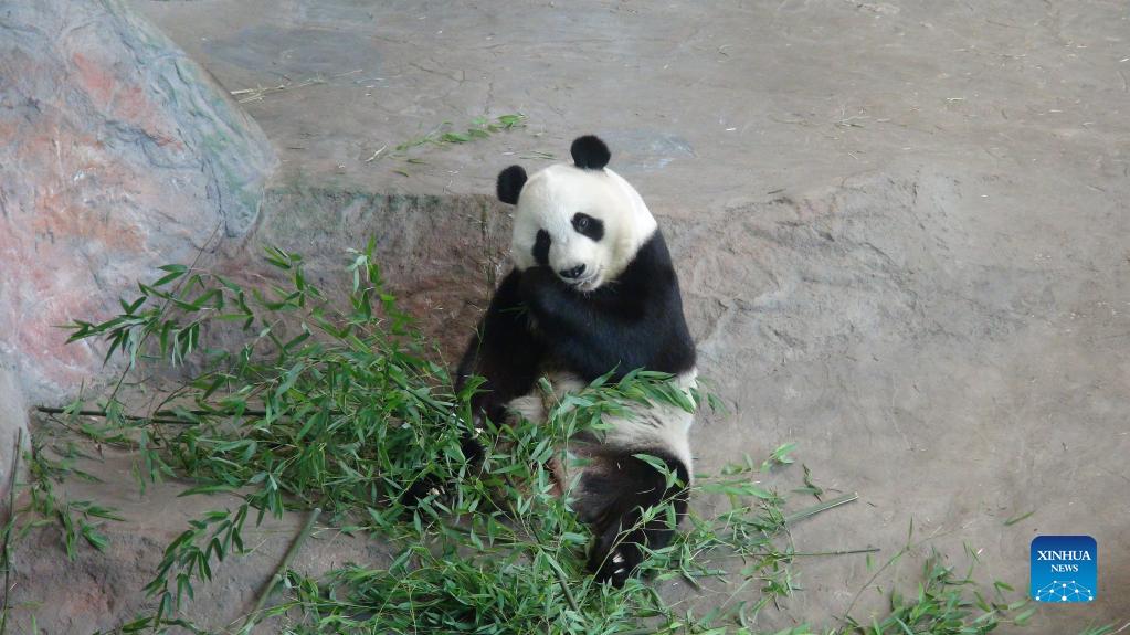 Giant panda Jin Baobao eats bamboo at Ahtari zoo in Ahtari, Finland, Sept. 18, 2021. Sept. 18 marks Jin Baobao's birthday. In January 2018, two pandas, Hua Bao and Jin Baobao, arrived in Finland, the first Nordic country to receive a pair of giant pandas from China. Finns gave them the Finnish nicknames "Pyry" and "Lumi," which mean "heavy snowfall" and "snow." (Xinhua/Chen Jing)