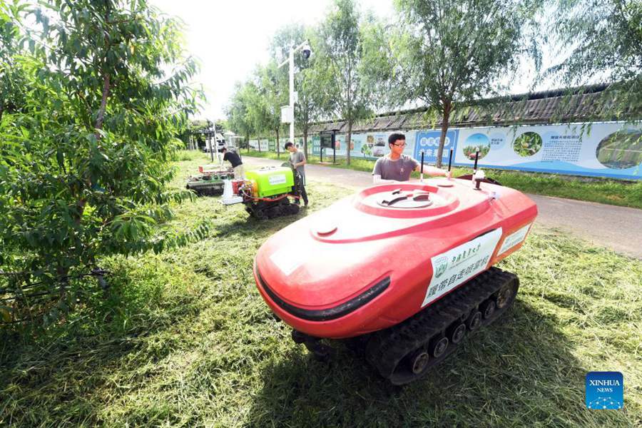 Lin Guihai, a college students from China Agricultural University, check autopilot sprayer in Future Orchard in Xiying Village of Yukou Township in Pinggu District of Beijing, capital of China, Aug. 25, 2021. "Future Orchard" is a high-tech orchard founded by local government with China Agricultural University and other enterprises. The orchard has a lab and four hectares of land with peach and kiwi trees. With the help of intelligent monitoring system for data analysis, accurate management and visual diagnosis on the environment of fruit trees, the orchard realizes improvement of planting efficiency, fruit yield and quality. (Xinhua/Ren Chao)