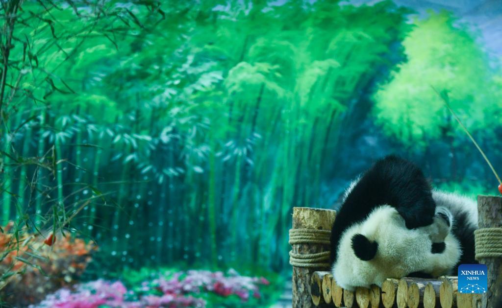 Giant Panda "Qi Guo" plays at the panda house of Xining Wildlife Park in Xining, northwest China's Qinghai Province, Sept. 19, 2021. Tourists visited the panda house on Sunday, the first day of the 3-day Mid-Autumn Festival holiday. (Xinhua/Xue Yubin)