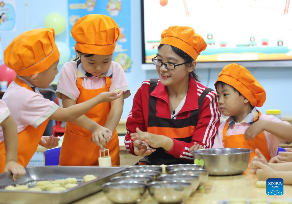 Children learn to make mooncakes at a kindergarten in Lincheng County of Xingtai, north China's Hebei Province, Sept. 19, 2021. The kindergarten held a folk culture activity on Sunday to greet the upcoming Mid-Autumn Festival that falls on Sept. 21. (Xinhua/Luo Xuefeng)