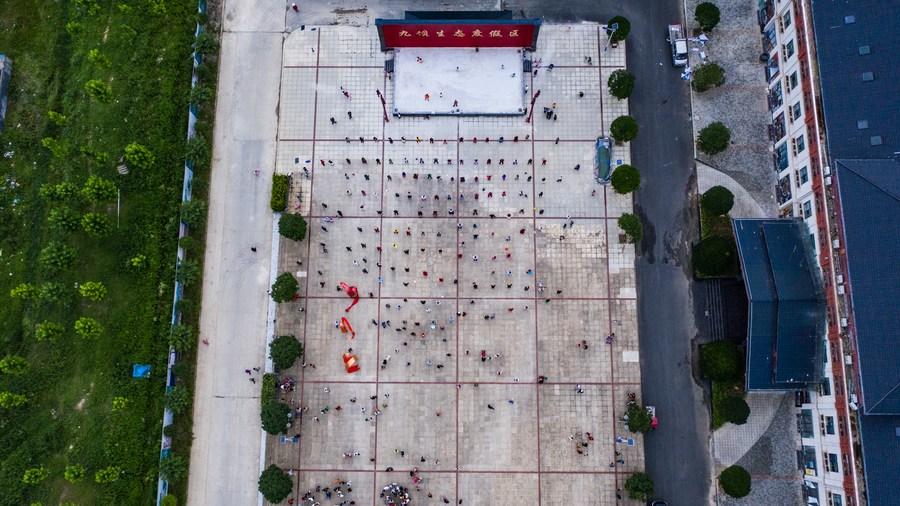 Aerial photo shows tourists taking part in a square dance in Shanbao community of Jiuba Township, Tongzi County, southwest China's Guizhou Province, July 21, 2020. (Xinhua/Tao Liang)