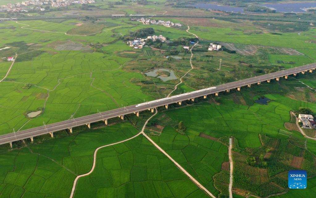 Aerial photo taken on Sept. 19, 2021 shows a bullet train running above paddy fields in Gula Township, Binyang County, south China's Guangxi Zhuang Autonomous Region. (Xinhua/Huang Xiaobang)