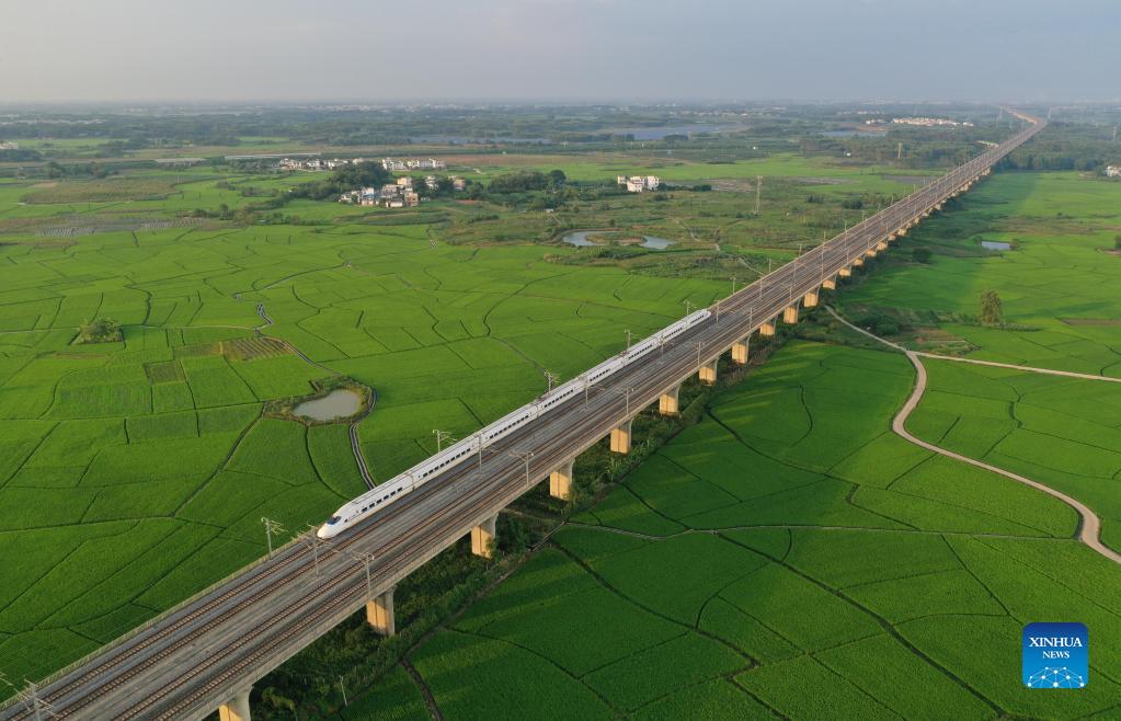 Aerial photo taken on Sept. 19, 2021 shows a bullet train running above paddy fields in Gula Township, Binyang County, south China's Guangxi Zhuang Autonomous Region. (Xinhua/Huang Xiaobang)