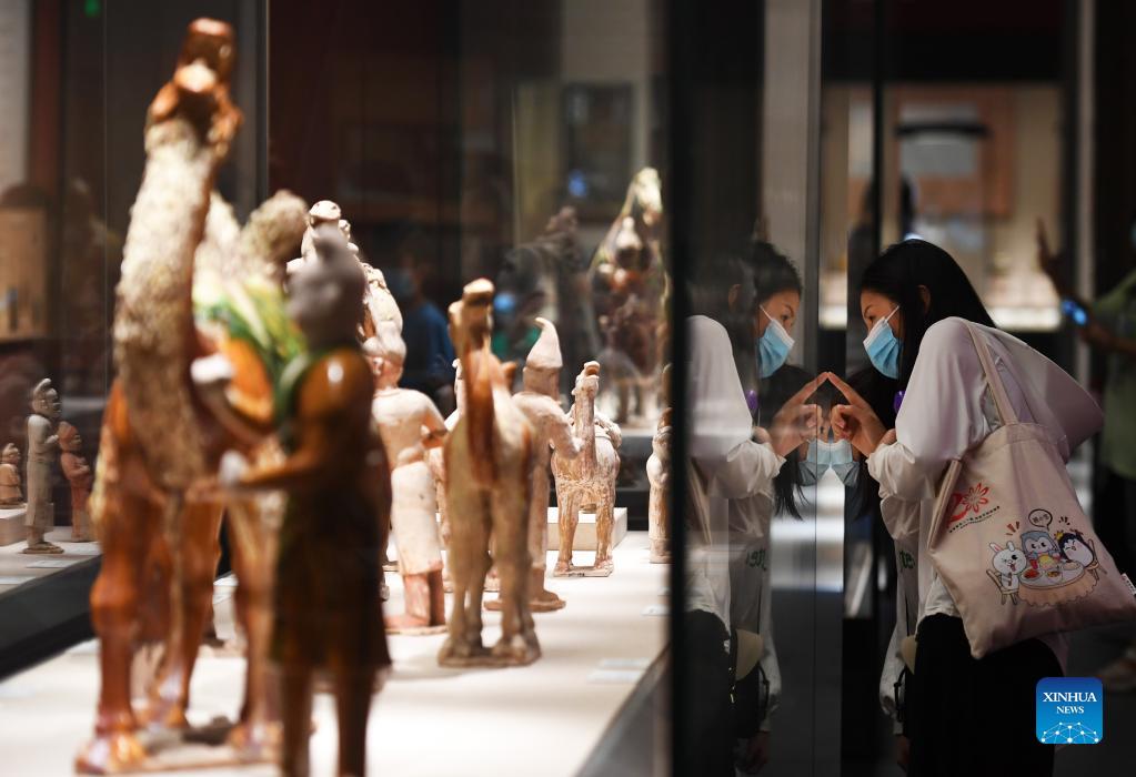 People view tri-colored glazed potteries displayed at Henan Museum in Zhengzhou, central China's Henan Province, Sept. 20, 2021. Many people visited the museum during the Mid-Autumn Festival holiday. (Xinhua/Zhang Haoran)