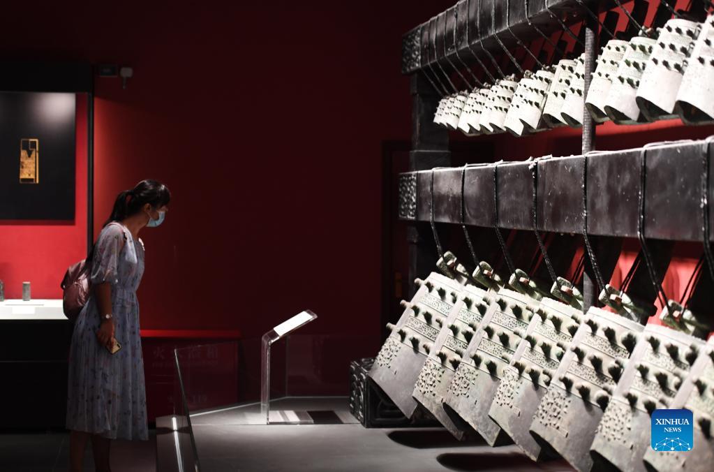 A woman views chime bells displayed at Henan Museum in Zhengzhou, central China's Henan Province, Sept. 20, 2021. Many people visited the museum during the Mid-Autumn Festival holiday. (Xinhua/Zhang Haoran)