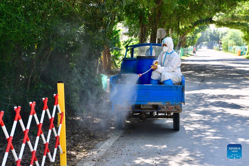 A staff member performs disinfection at Xintang Village, Xinmin Township, Tongan District of Xiamen City, southeast China's Fujian Province, Sept. 20, 2021. Experts under the State Council inter-agency task force for COVID-19 response have arrived at high and medium COVID-19 risk areas in Tongan on Monday to guide local epidemic prevention and control. (Xinhua/Jiang Kehong)