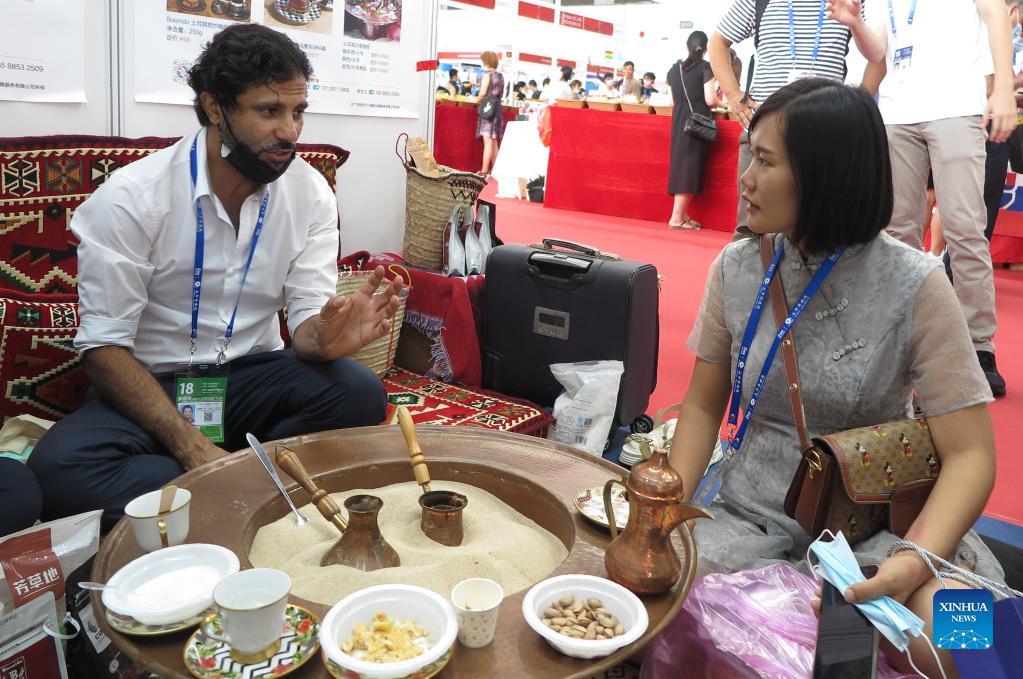 Exhibitor Osan (L) introduces Turkish sand-brewed coffee to a visitor at the 18th China-ASEAN Expo held in Nanning, capital of south China's Guangxi Zhuang Autonomous Region, Sept. 11, 2021. (Xinhua/Zhu Lili)