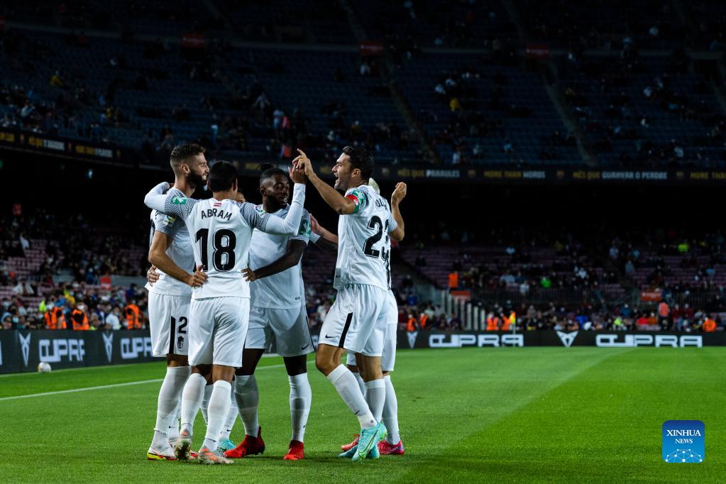 Granada's players celebrate their goal during a Spanish first division league football match between FC Barcelona and Granada CF in Barcelona, Spain, on Sept. 20, 2021. (Photo by Joan Gosa/Xinhua)