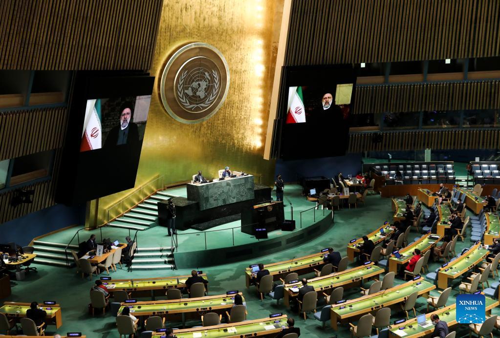 Iranian President Ebrahim Raisi (on the screens) remotely speaks during the General Debate of the 76th session of the United Nations General Assembly at the UN headquarters in New York, on Sept. 21, 2021. Raisi said on Tuesday that his country does not trust the promises made by the U.S. government, while noting that he seeks effective interaction with all the countries of the world. (Xinhua/Wang Ying)