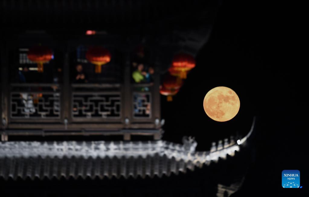 A full moon is seen at Yanzhou ancient town in Jiande City of east China's Zhejiang Province, Sept. 21, 2021. (Xinhua/Xu Yu)