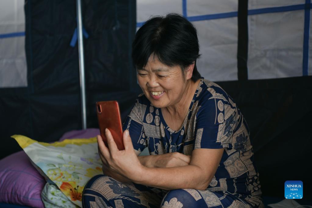 A woman chats with relatives via video call at a temporary resettlement site in Tuancang Village of Fuji Township of Luxian County, southwest China's Sichuan Province, Sept. 21, 2021. Residents from Sichuan Province who were affected by an earthquake that struck on Sept. 16 began returning home on Monday morning, as the local work priority has been shifted from emergency rescue to post-quake reconstruction. A 6.0-magnitude earthquake jolted Luxian County in the city of Luzhou at 4:33 a.m. on Sept. 16, leaving three people dead and 146 injured. (Xinhua/Xu Bingjie)