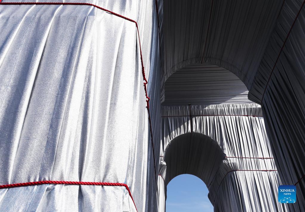 The wrapped Arc de Triomphe is seen in Paris, France, Sept. 21, 2021. The entire Arc de Triomphe at the top of the Champs-Elysees in Paris is to stay wrapped in fabric for two weeks, an art installation conceived by the late artist Christo and inaugurated on Thursday by French President Emmanuel Macron. (Xinhua/Gao Jing)