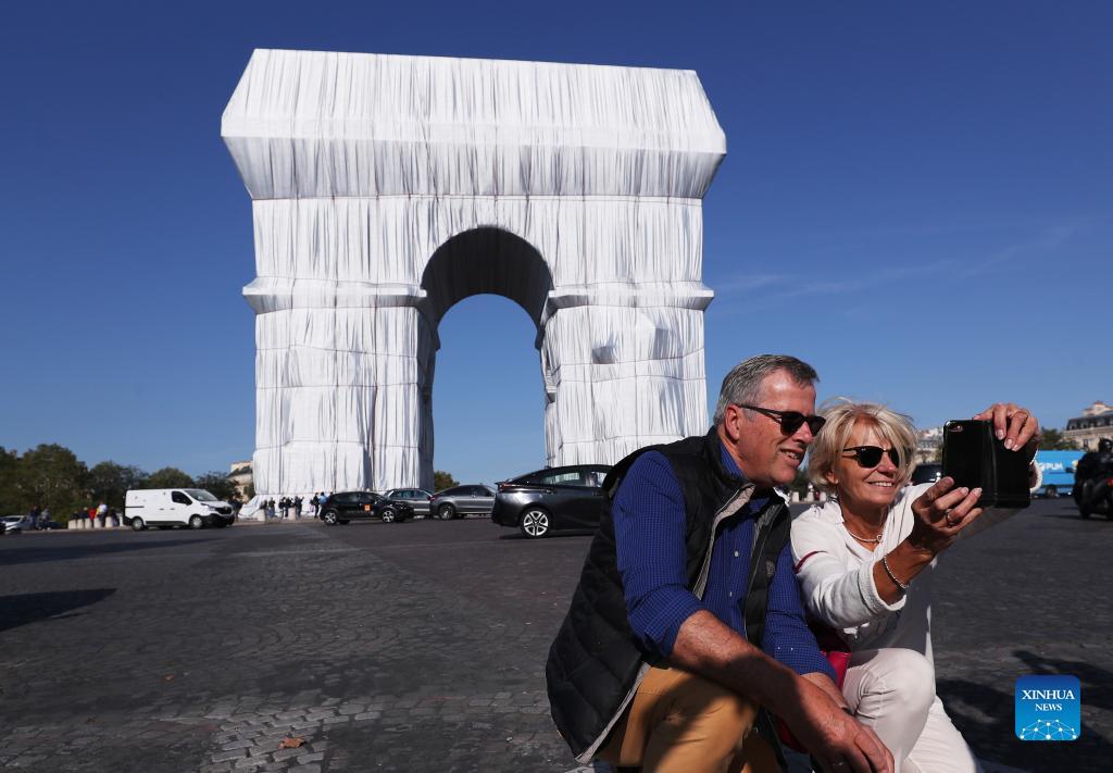 People take souvenir photos in front of the wrapped Arc de Triomphe in Paris, France, Sept. 21, 2021. The entire Arc de Triomphe at the top of the Champs-Elysees in Paris is to stay wrapped in fabric for two weeks, an art installation conceived by the late artist Christo and inaugurated on Thursday by French President Emmanuel Macron. (Xinhua/Gao Jing)