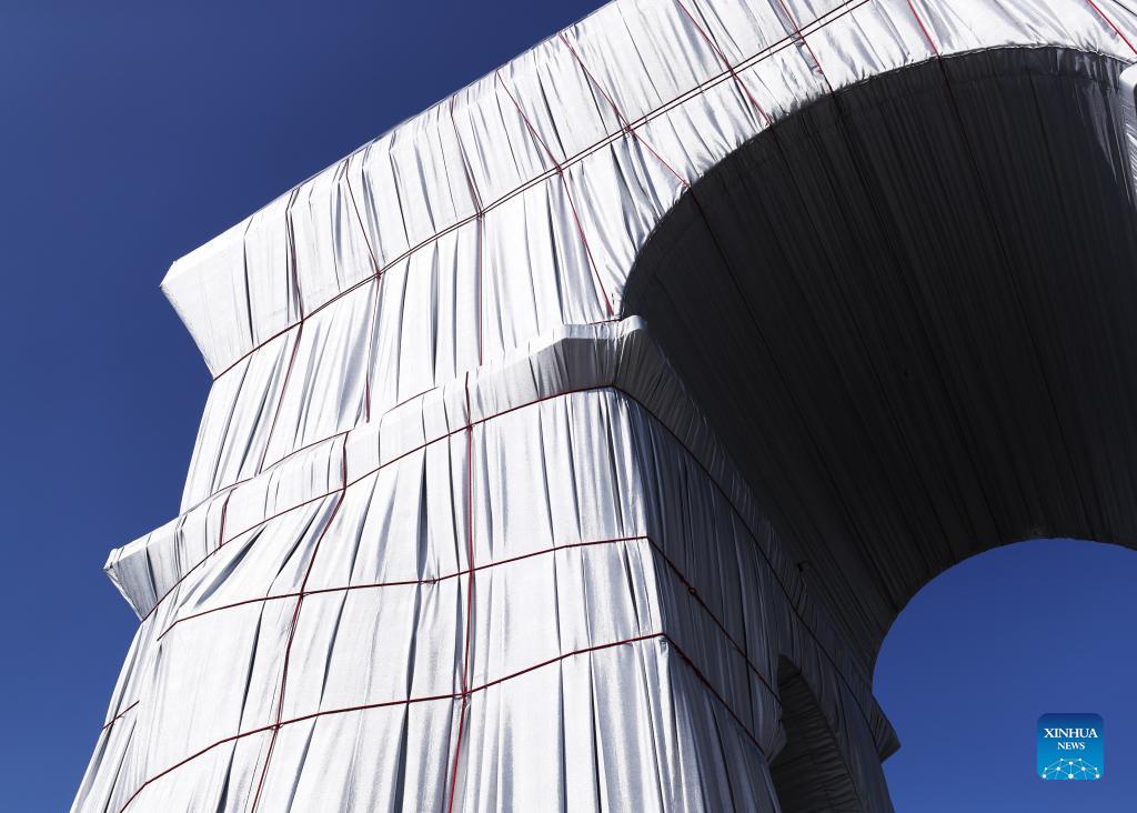 The wrapped Arc de Triomphe is seen in Paris, France, Sept. 21, 2021. The entire Arc de Triomphe at the top of the Champs-Elysees in Paris is to stay wrapped in fabric for two weeks, an art installation conceived by the late artist Christo and inaugurated on Thursday by French President Emmanuel Macron. (Xinhua/Gao Jing)