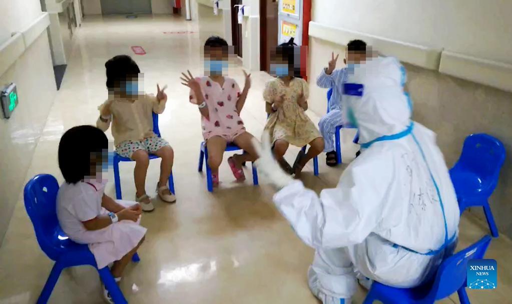 Video image captured on Sept. 21, 2021 shows a medical worker playing games with child patients who have been diagnosed with COVID-19 at an isolation ward of the Affiliated Hospital (Group) of Putian University in Putian, southeast China's Fujian Province. Amid the latest resurgence of COVID-19, some children have been diagnosed with the disease in Putian City. During the Mid-autumn festival, which is usually marked by family reunions, medical staff members working here played games with the child patients staying here away from their families. To make the environment child friendly, the hospital has decorated treatment wards and corridors with cartoons and adopted a targeted treatment approach with nursing and support programs. They also prepared mooncakes and toys for the young patients so as to soothe possible homesickness and the nerves. (Xinhua)